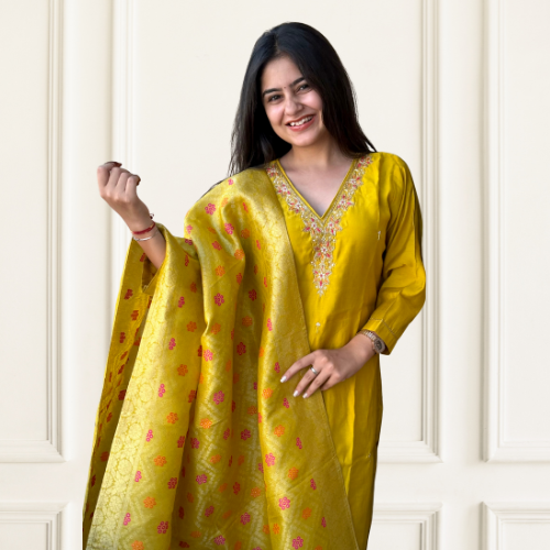 Pure Vatican Silk Yellow Coord Set with Zardozi Work